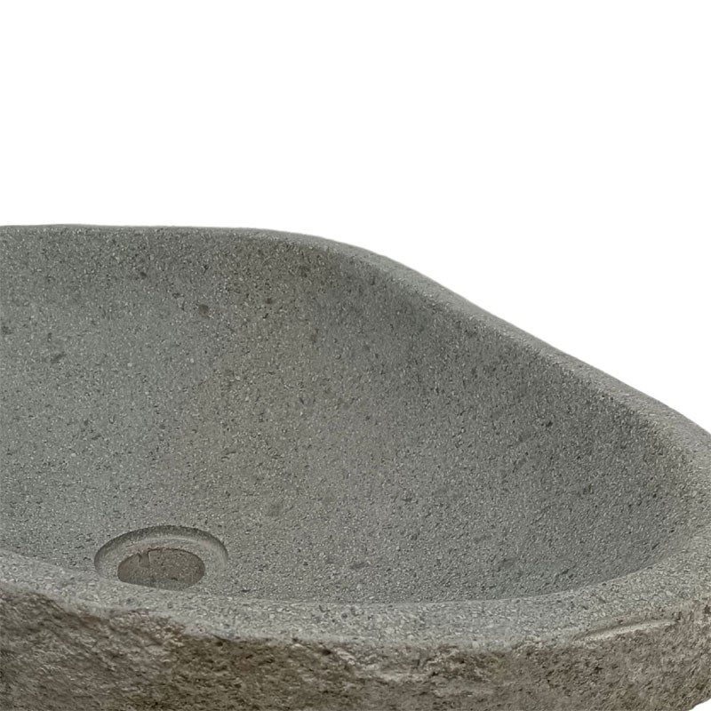 Avec cette grande vasque en pierre, vous apporterez un charme inouï et une véritable personnalité à votre salle de bain. Ce lavabo à poser en galet est fabriqué de manière artisanale. Il a effectivement été taillé dans un véritable galet de rivière indonésien puis travaillé et doté d'une résine hydrofuge. L’extérieur est laissé tel quel pour lui donner un aspect brut et naturel tandis que l’intérieur est travaillé pour faciliter son entretien et permettre une longue durée de vie.